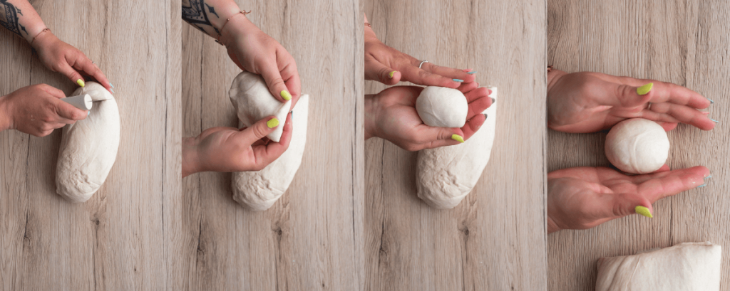 2. Auf diese Weise 8 Teigkugeln formen, mit Frischhaltefolie abdecken und 30 Minuten gehen lassen.