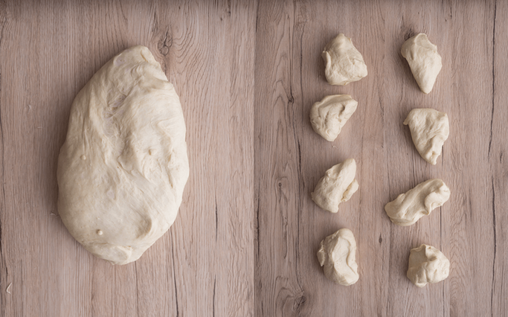 2. Den Teig auf die bemehlte Arbeitsfläche stürzen und in 8 gleichgroße Portionen aufteilen. Dafür zunächst einen gleichmäßig dicken Laib formen, diesen längs und quer halbieren, dann jedes Teigviertel noch einmal quer halbieren.