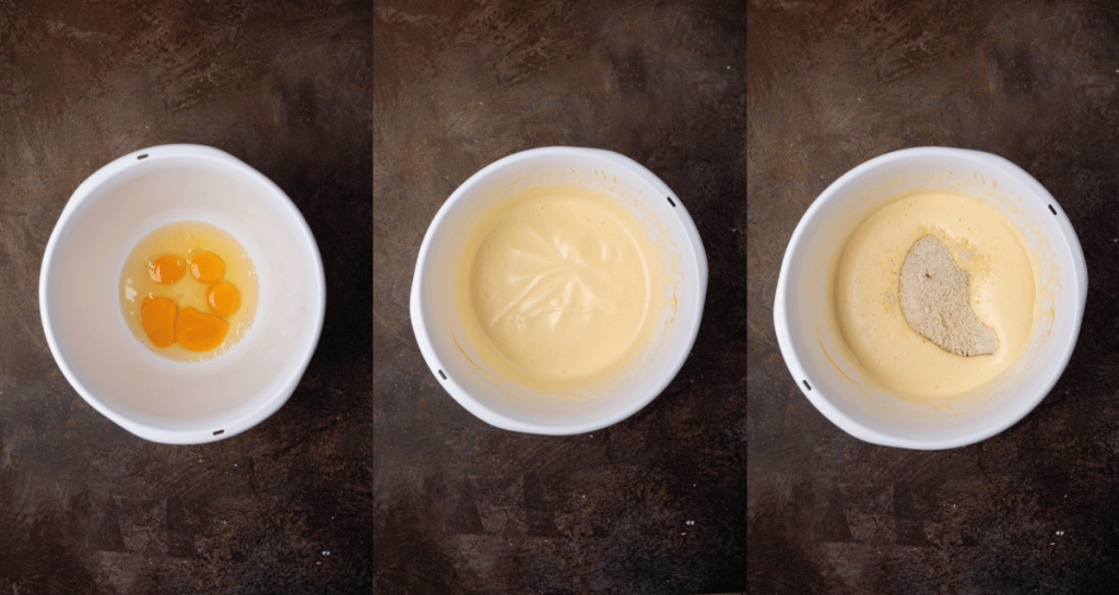 1. U posudu razbijte jaja i električnim mikserom ih mutite 7 minuta.
