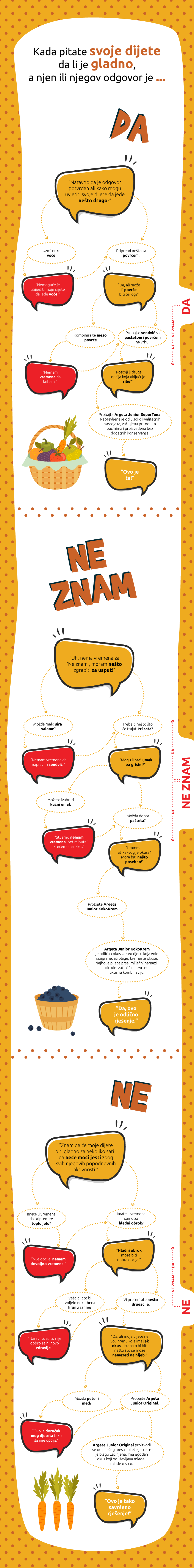 To je ista stara kombinacija pitanja, zar ne? "Jesi li gladan? Što bi volio jesti?" Sa Argeta Junior proizvodima napravljenim bez dodatnih konzervansa, ne morate brinuti o sljedećoj užini vašeg djeteta. Želimo vam predstaviti najbolje moguće odluke.
