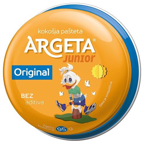 Jedan od najzgodnijih, najukusnijih i najhranljivijih obroka svakako je užina, napravljena sa Argeta Junior paštetom. Preporučuju je mame širom svijeta, jer je napravljena posebno za djecu i broj 1. je u Evropi* kada je riječ o mesnim i ribljim paštetama. Sve Argeta Junior dječije paštete su napravljene po recepturi BEZ, koja garantuje da ne sadrže konzervanse, vještačke boje, pojačivače arome i gluten. Posebno smo ponosni na našu Argeta Junior Original paštetu, koja sadrži manje masti, ima dodatnu hranjivu vrijednost i odličan je izvor bjelančevina.