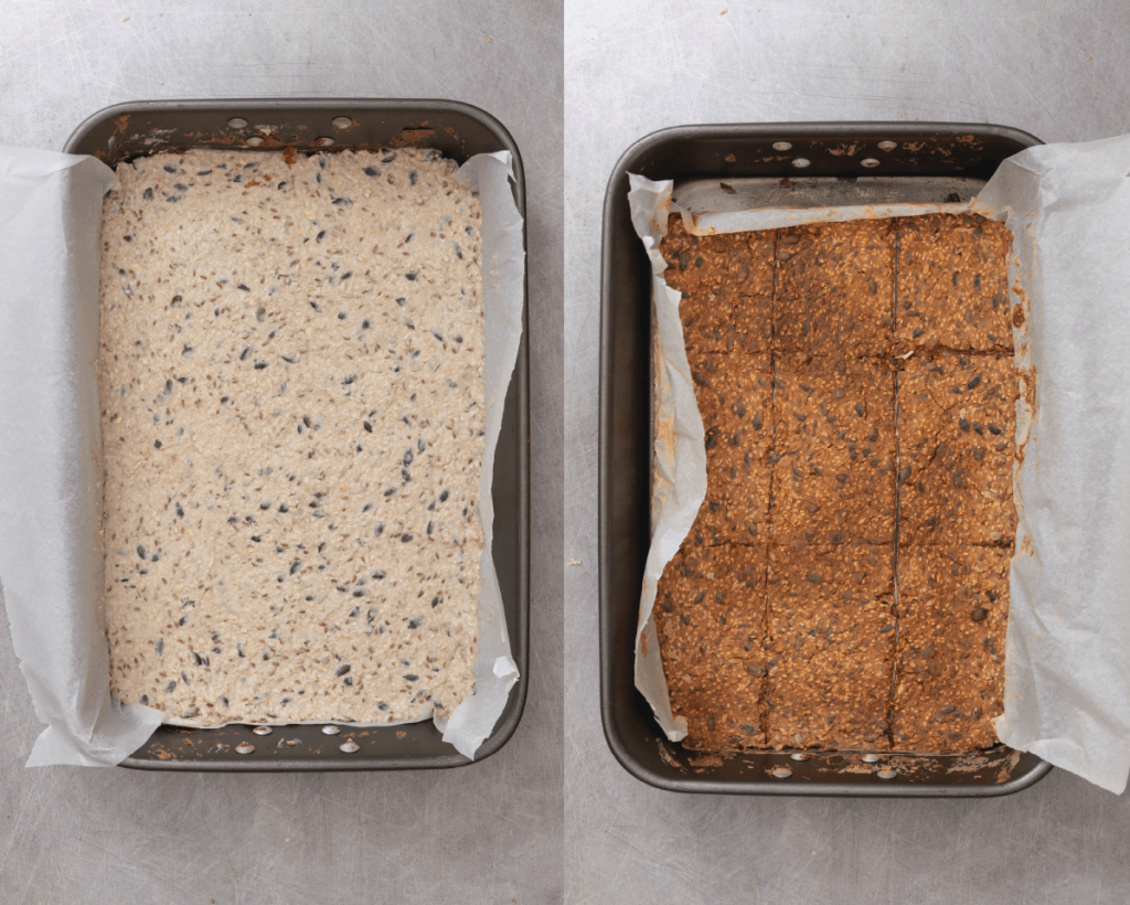 7. Das Backblech aus dem Ofen nehmen und das Brot in Quadrate schneiden.