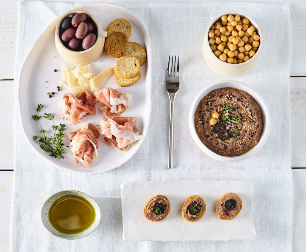 Des ingrédients naturels soigneusement sélectionnés : pois chiches, olives noires, sésame et épices.