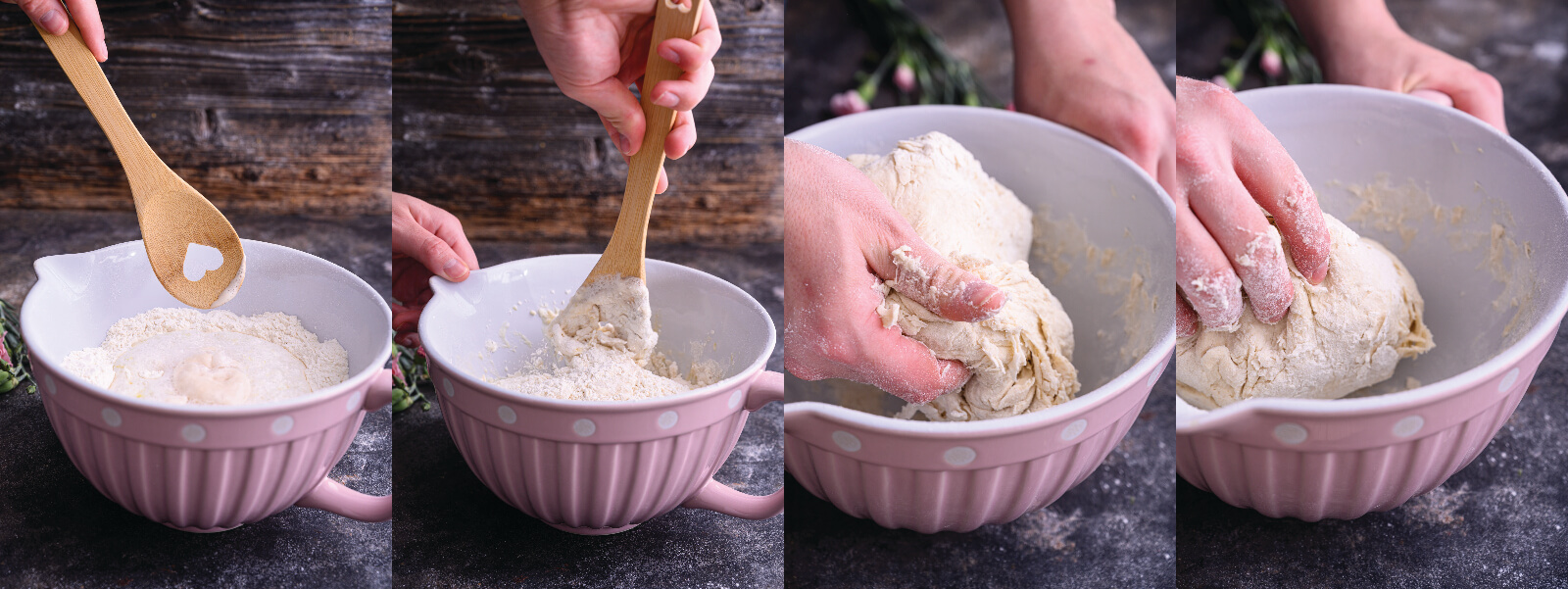 - Pétrissez pendant 5 à 10 minutes en saisissant le bord supérieur et en poussant vers le bas loin de vous à l’aide uniquement du talon de la main. Tournez la pâte continuellement pendant que vous pétrissez.