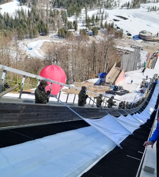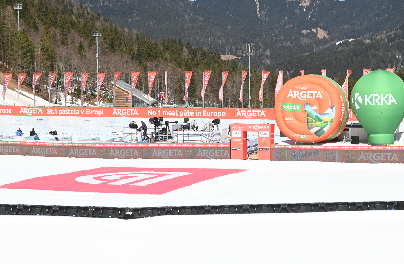 Es war ein wunderschöner Tag, aber die Bedingungen waren nicht ideal für den Schnee, der bereits am Morgen zu schmelzen begann. Die slowenische Bundeswehr schützte den Schnee und beschattete ihn, während das Organisationsteam Fichten aufstellte, um den Teilnehmern zu helfen, das diffuse Licht zu überwinden und sich in der Luft zu orientieren.