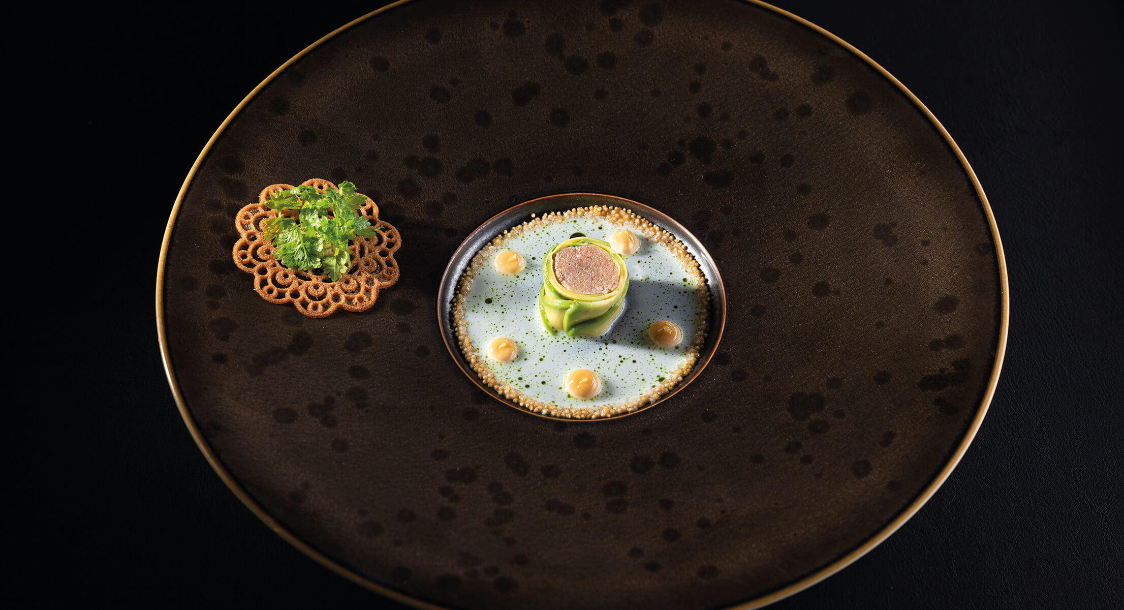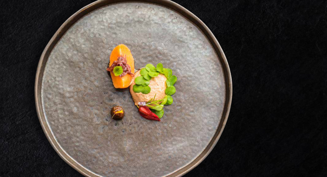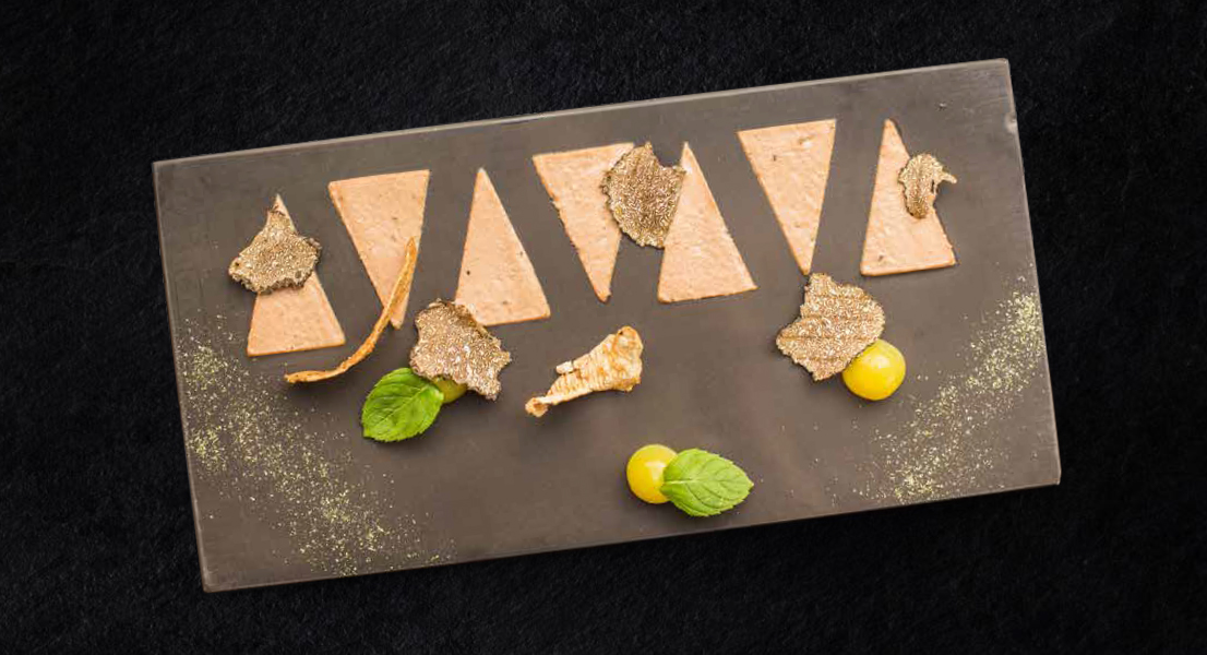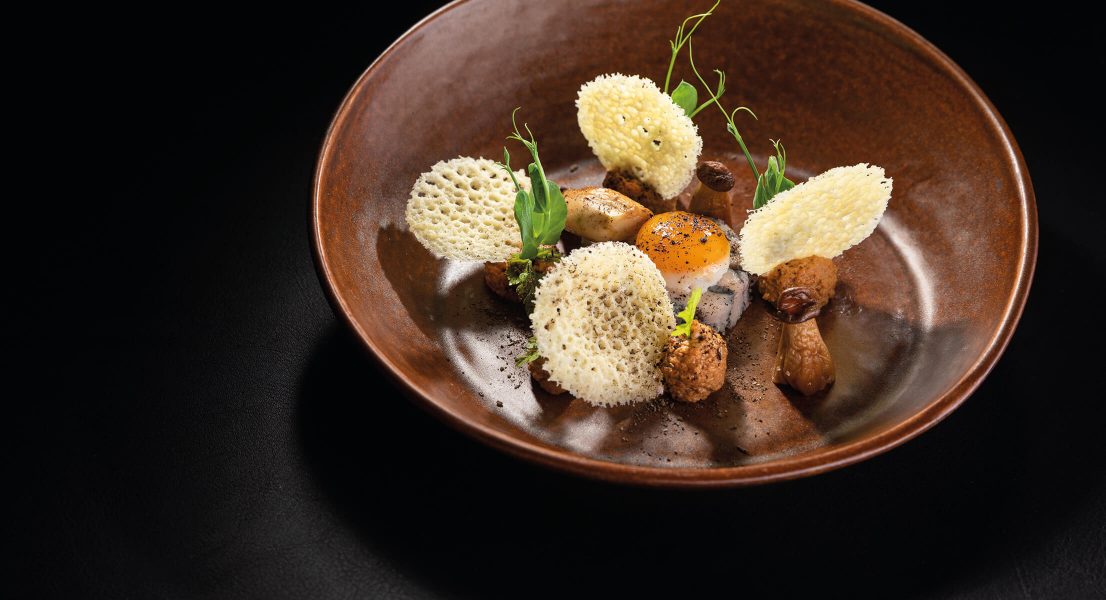 Dva filea biserke marinirajte 1 sat s gljivama u prahu i soli. Zatim ih zamotajte u kolut i pirjajte 45 minuta na 64°C. Nakon što je mesna rolada skuhana, pustite je da se ohladi i stavite u hladnjak na 20 minuta. Kad se ohladi, narežite je na kriške. Dok se rolada hladi, dimljeni sir izrežite modlicama za kolačiće i stavite na zagrijanu tavu. Zagrijte sir dok ne postane hrskav, a zatim pažljivo izvadite hrskavce iz tave. U istoj tavi zagrijte malo ulja i dodajte cijele gljive. Pecite ih sve dok ne dobiju lijepu i nježnu smeđu boju. Iz tave izvadite gljive i u njoj zatim ispecite prepeličja jaja ‘na oko’. Kad je bjelanjak pečen, izvadite jaja iz tave i izrežite ih tako da ostanu samo cijeli žumanjci.