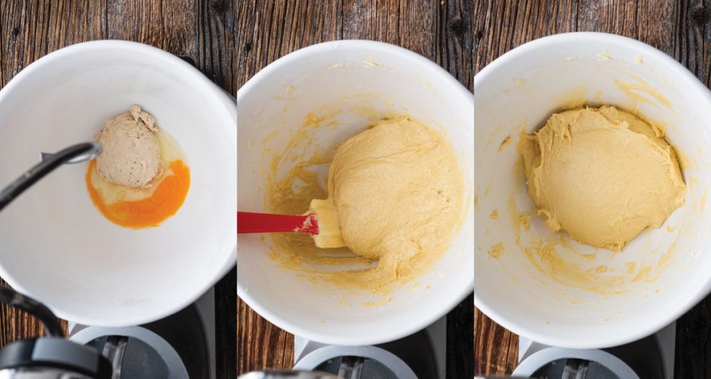 1. U kuhinjski mikser postavite priključak sa silikonskom lopaticom, a u posudu stavite predtijesto koje se diglo.