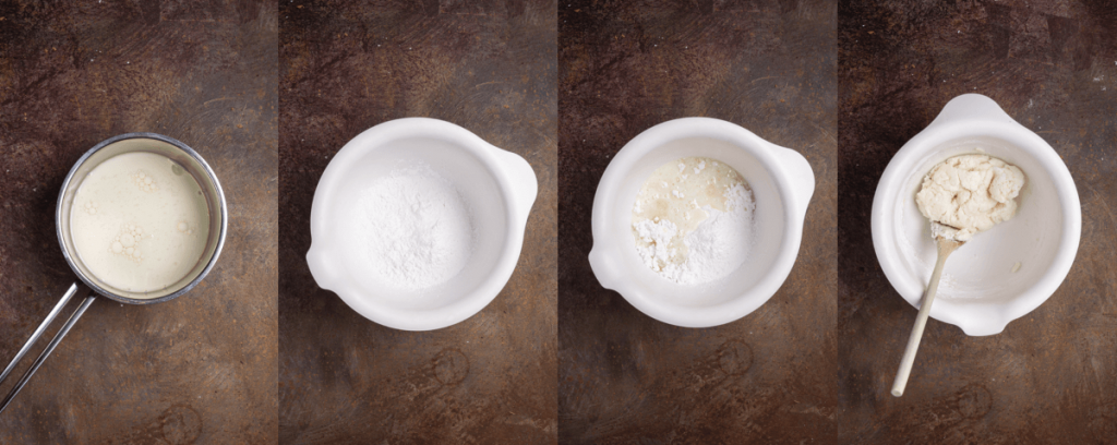 2. Brašno od tapioke pomiješajte sa solju, a zatim dodajte vrelu mješavinu mlijeka i ulja.
