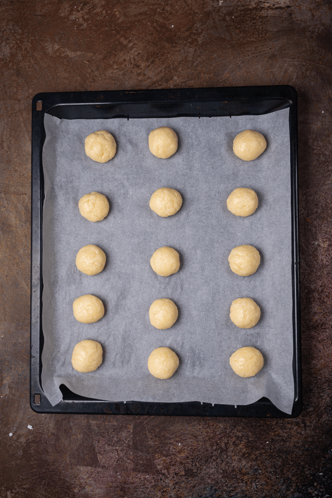 5. Od smjese u dlanovima oblikujte kuglice od 40 g te ih rasporedite po velikom limu prekrivenom papirom za pečenje.