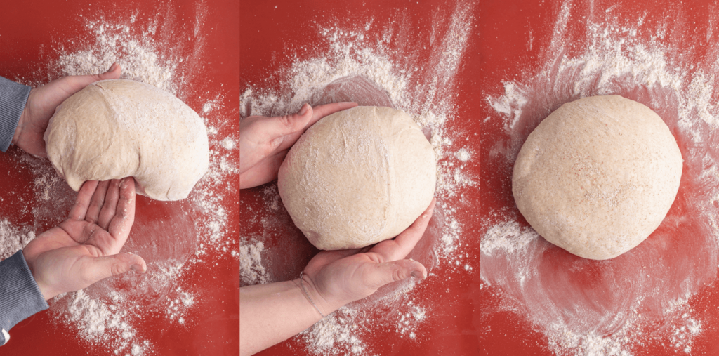 8. На набрашнета површина формирајте лепче од тестото – зграпчете го горниот дел од тестото кој е подалеку од нас, повлечете го кон себе и свиткајте го. Повторете го процесот на левата и десната страна, а на крајот и на дното.