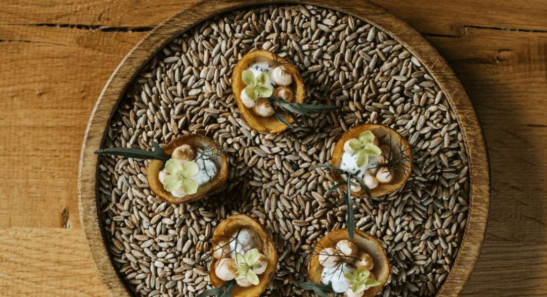 Låt potatisskalen svalna något. Fyll dem med gräddfil och paté. Komplettera måltiden med dillkvistar och färska blad av rocketsallad. Om så önskas, dekorera tallriken med sommarblommor. Servera de fyllda skalen medan de fortfarande är lite varma.
