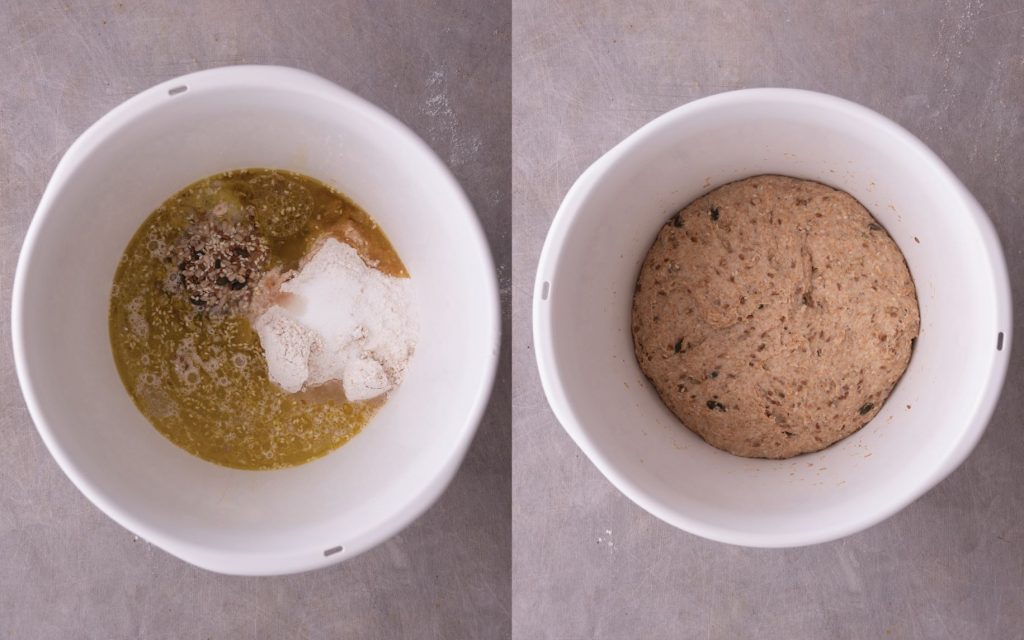 1. Blanda båda mjölsorterna med frön, socker, salt och torrjäst i en stor skål.