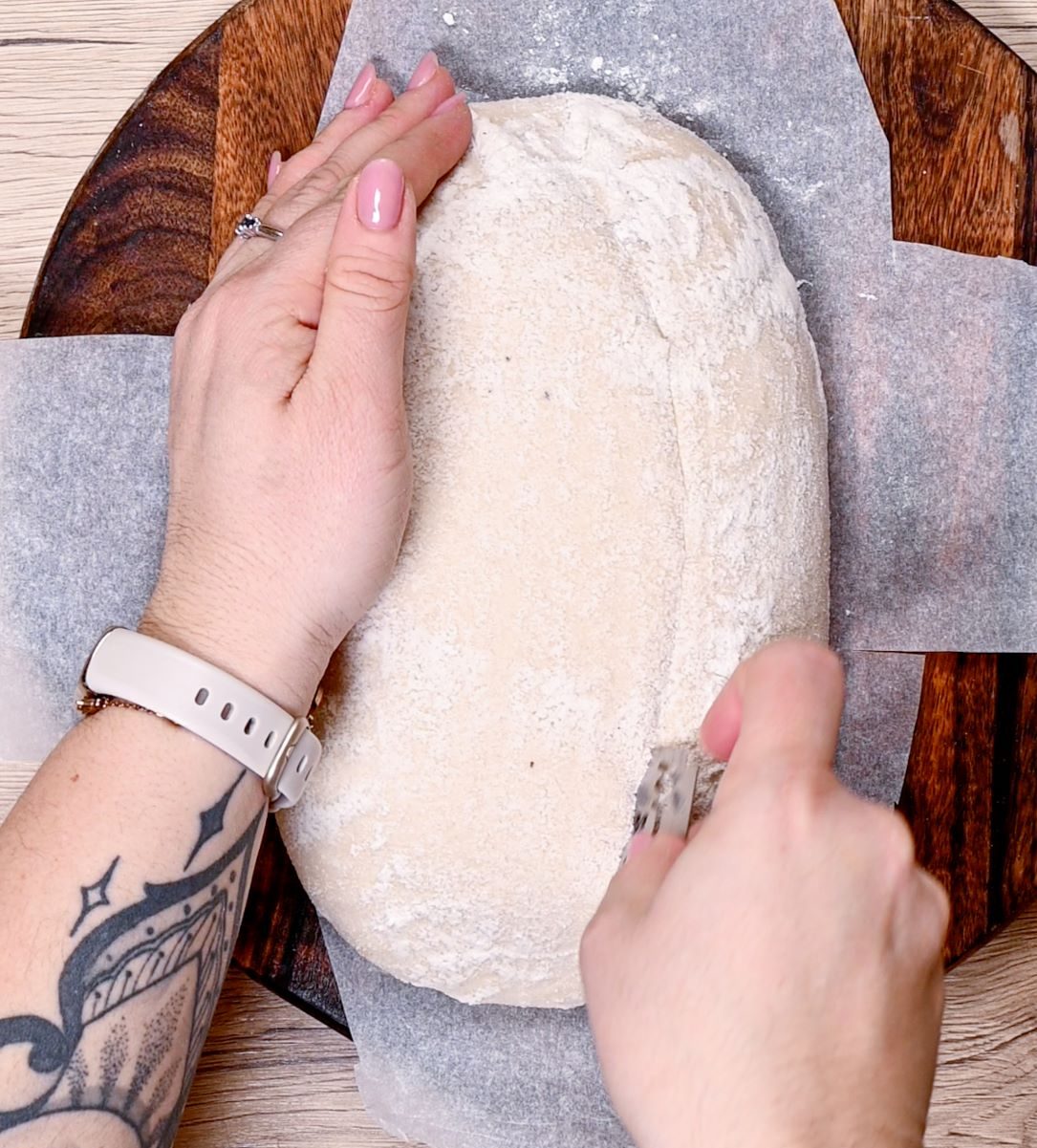 4. Vzhajalno košarico dvignemo, testo pa narahlo pogladimo z dlanjo.