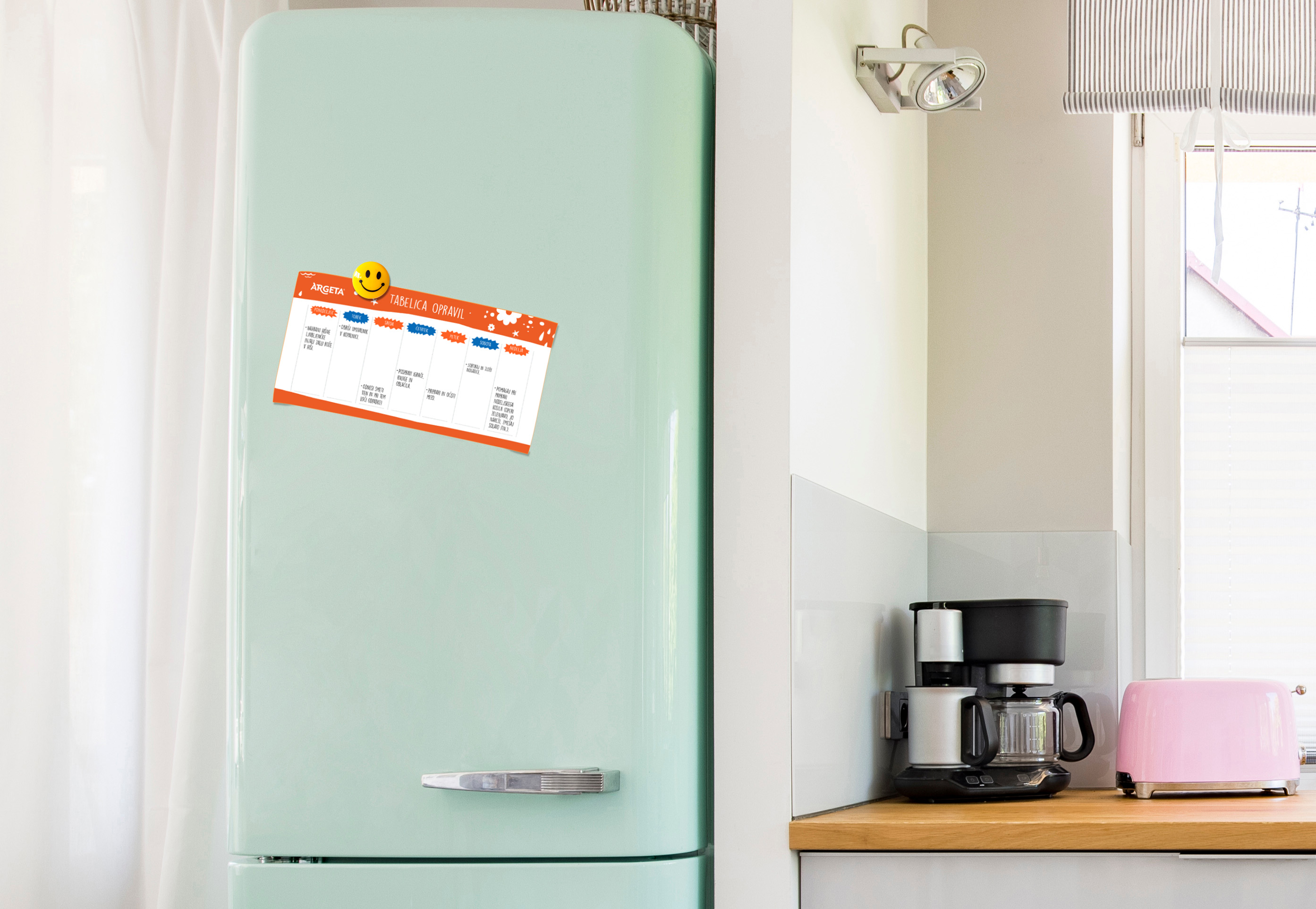 Pripravili smo dokument z enim predhodno izpolnjenim tednom za lažji začetek in dvema praznima tednoma, katera lahko organiziraš po lastnih potrebah. Dokument natisni, ga razreži po tednih ter vpiši opravila otrok, kdaj naj jih naredijo in morebitne nagrade. Razpredelnico z magnetom obesi na hladilnik in tvoji otroci so pripravljeni za cel teden.