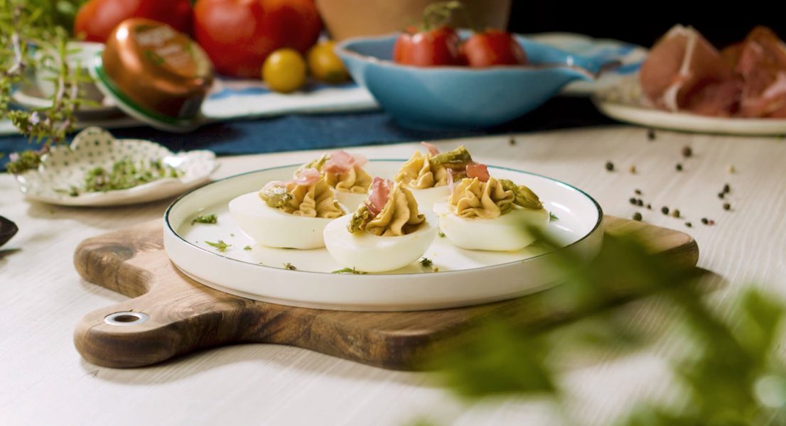 Rumenjake odstranimo, jim dodamo namaz, začinimo in dodamo nariban tartuf. Vse skupaj dobro zmiksamo v kremo. S pomočjo dresirne vrečke kremo nabrizgamo v polovičke beljakov. Jajca okrasimo s šparglji in pršutom.