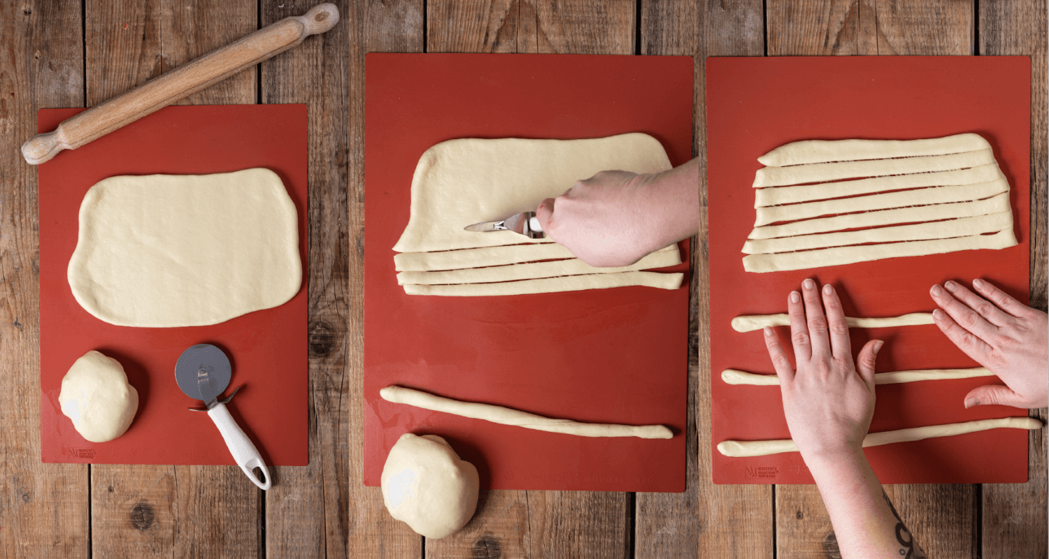 - Z okroglim nožem za pico ga narežemo na trakove, debele kot prst.