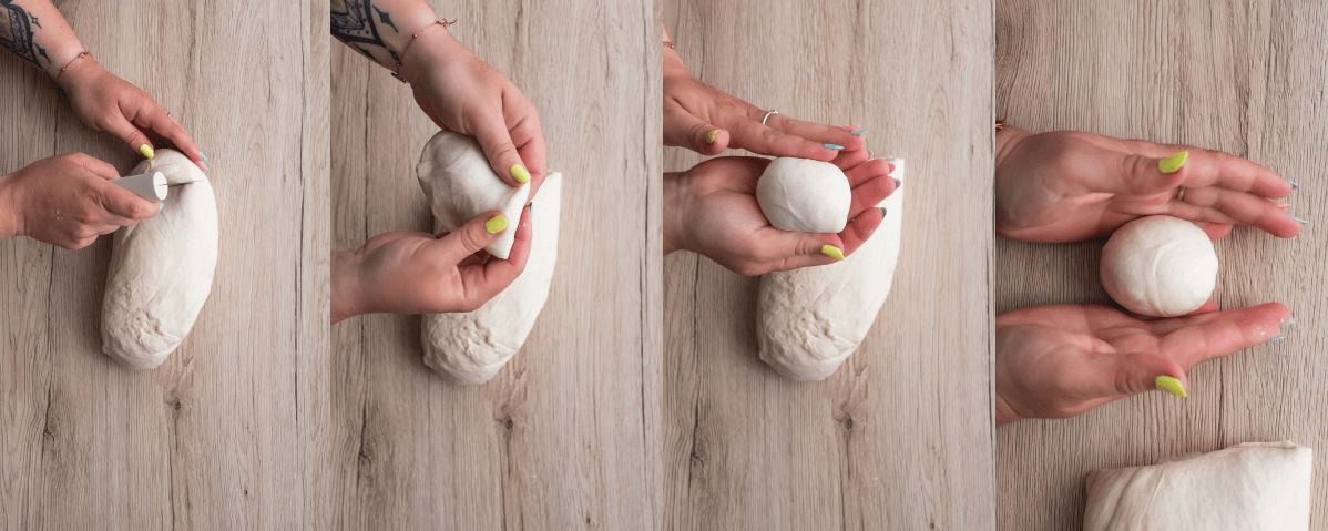 1. Od testa odtrgamo kos, težek približno 80 g in ga s prsti oblikujemo v kroglico – testo zbiramo v eni točki, s tem pa napenjamo površino krogle.