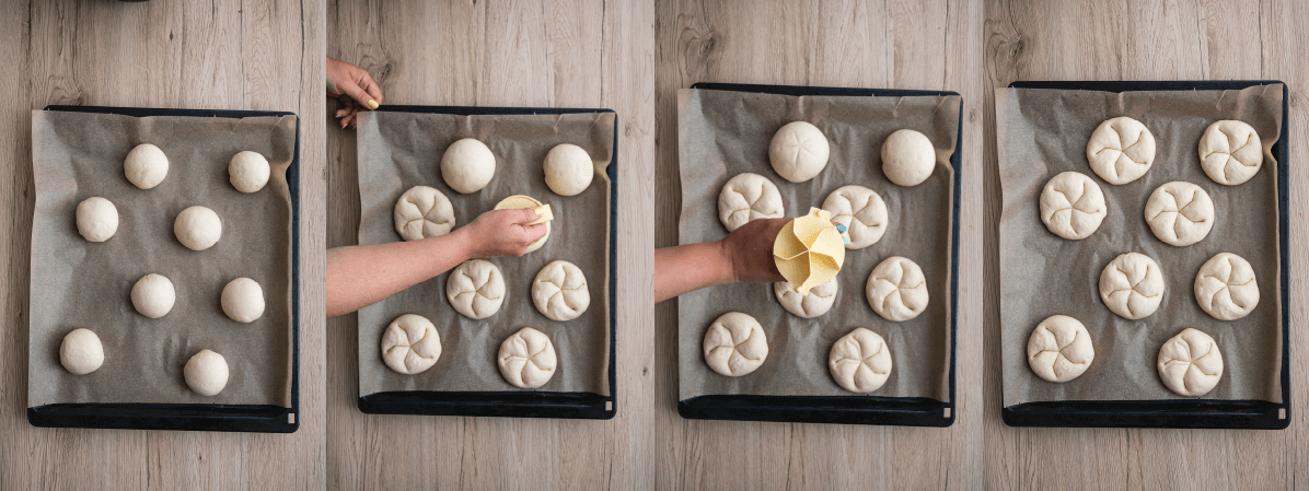 4. V vsako kroglico z modelčkom za kajzerice vtisnemo značilni vzorec mlina na veter.