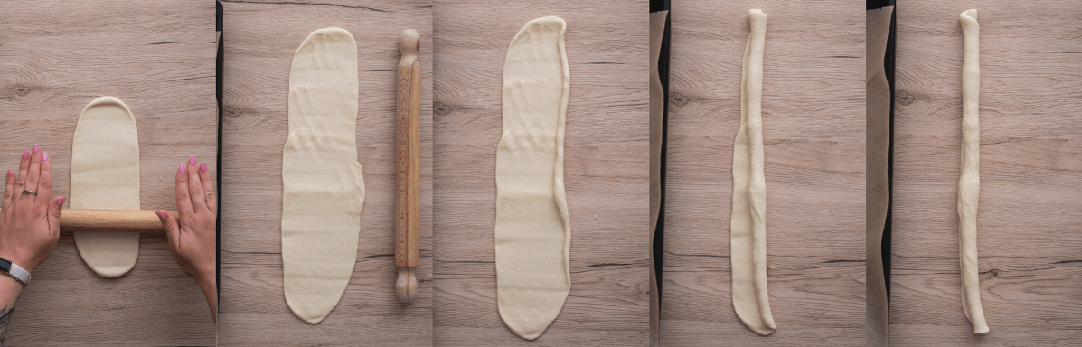 3. Vsak del na tanko razvaljamo do dolžine pekača.